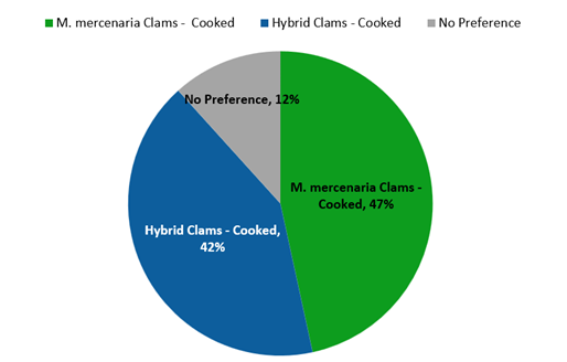 Preference: There was no preference for either raw M. mercenaria and raw hybrid and no significant preference for either cooked M. mercenaria and cooked hybrid. The resultes support earlier results from the University of Florida that showed no differences in acceptance or preferences for hybrid clams over M. mercenaria sold as fresh clams (Sturmer et al., 2009).